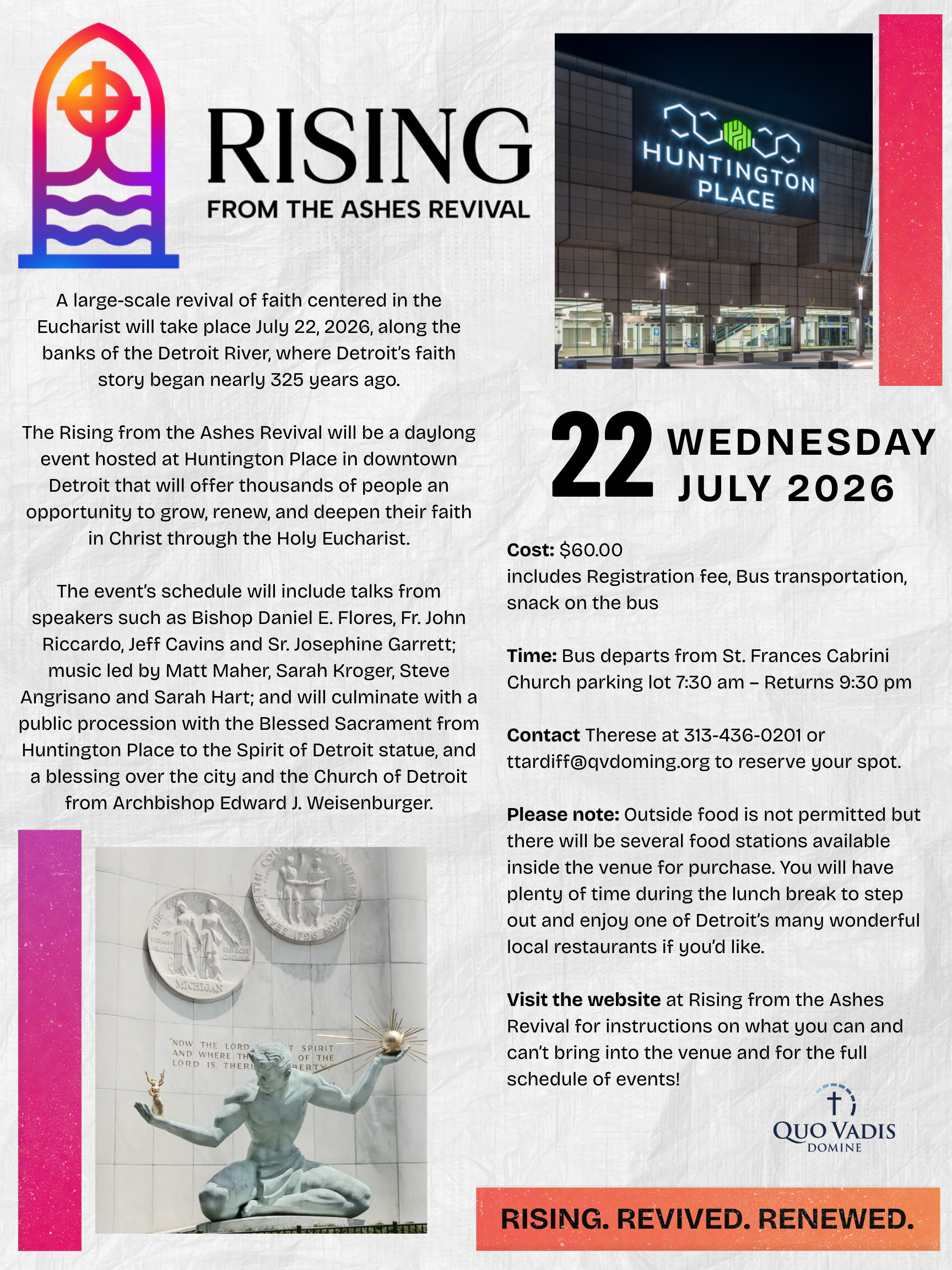 A large-scale revival of faith centered in the Eucharist will take place July 22, 2026, along the banks of the Detroit River, where Detroit’s faith story began nearly 325 years ago. The Rising from the Ashes Revival will be a daylong event hosted at Huntington Place in downtown Detroit that will offer thousands of people an opportunity to grow, renew, and deepen their faith in Christ through the Holy Eucharist.