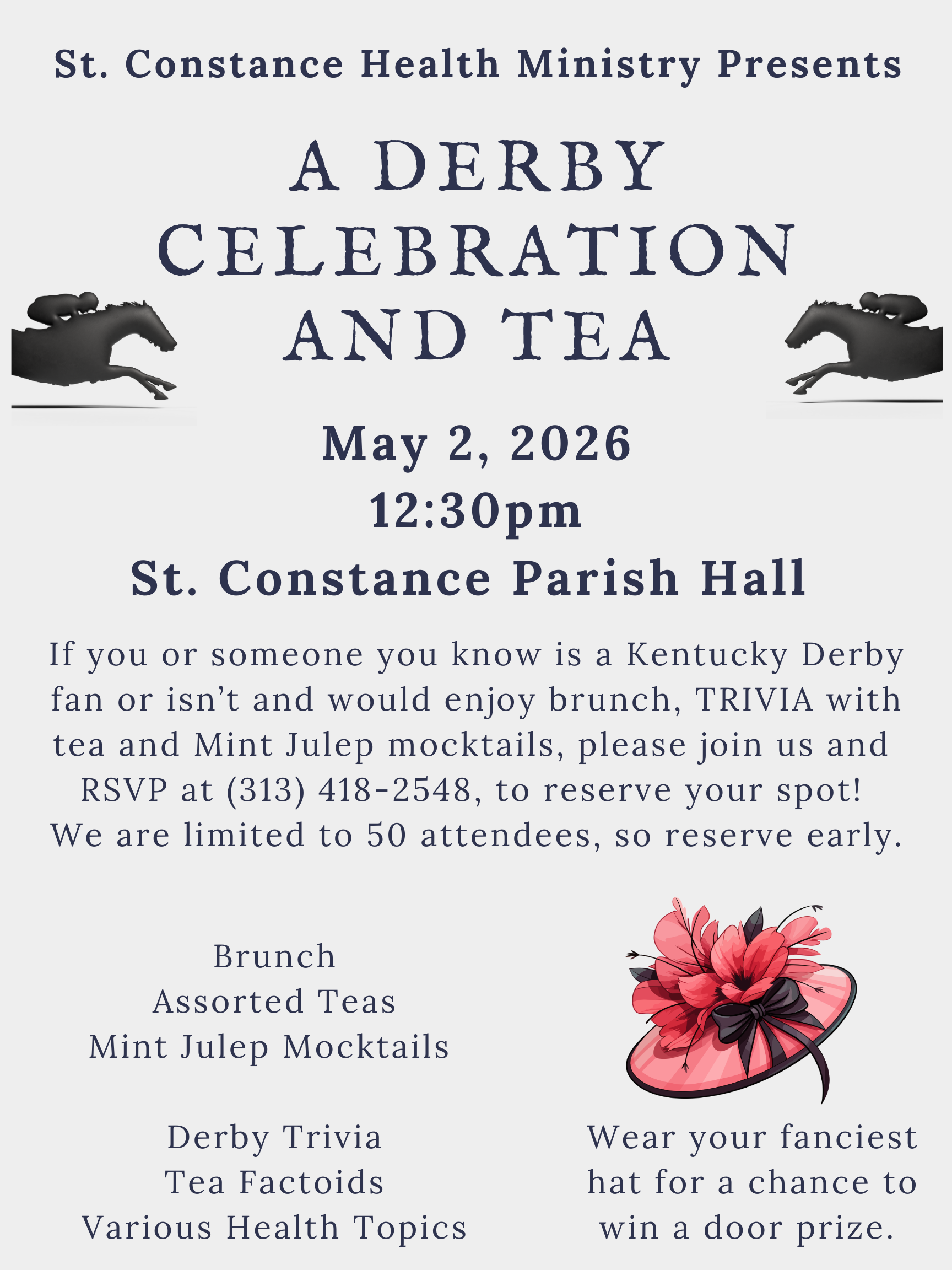 Get ready for a charming afternoon at our Derby Celebration & Tea hosted by the St. Constance Health Ministry!